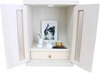 ペット仏壇 メモリアルボックス 観音扉 窓付き 家具調 ホワイト 骨壷収納 ペット仏具8点 肉球おりん敷き おりんセット付 大型犬も (ホワイト)