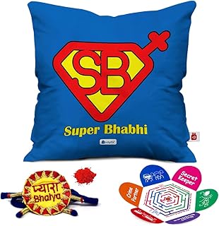 indibni RakhiギフトHamper Pyaari Bhabhi with Roli Chawal Happy RakshabandhanグリーティングカードSuper Bhabhi BehanaシンボルブルーPrinted 12 x 12クッションフィラーPerfectギフトコンボfor Brother Bhaiya