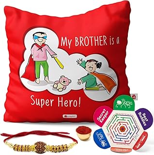 indibni Rakshabandhan RakhiギフトHamper Designer Crystal Studded Rakhi for Brother with Roli Chawal & Happy RakshabandhanグリーティングカードMy Brother IsスーパーヒーローレッドPrinted 12 x 12クッションフィラー