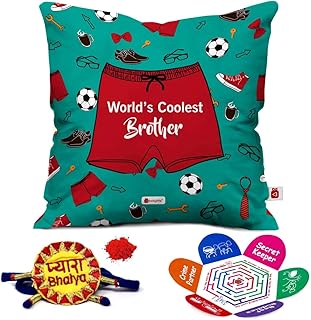 indibni Rakshabandhan RakhiギフトHamper Designer Crystal Studded Rakhi for Brother with Roli Chawal & Happy RakshabandhanグリーティングカードCoolest Brother Ever Blue Printed 12 x 12クッションフィラー