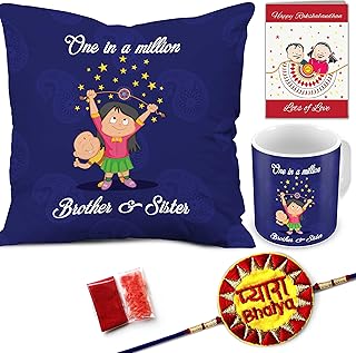 Indigifts Rakhi Gift for Brother Pyara Bhaiya with Roli - One in Million Brother Sister Blue Printed 12x12 Cushion with Filler & Ceramic Mug Combo for Bhaiya Rakhi Gift : Amazon.in: Home & Kitchen indibni RakhiギフトHamper Pyara Bhaiya with Roli Chawal Happy Rakshabandhan Greeting Card Happy RakshabandhanホワイトPrinted 12 x 12クッションフィラーPerfectギフトコンボfor Brother Bhaiyaが枕・抱き枕ストアでいつでもお買い得。当日お急ぎ便対象商品は、当日お届け可能です。アマゾン配送商品は、通常配送無料(一部除く