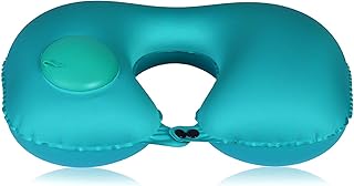 ネックピロー U型 手動プレス式膨らませる 旅行用 飛行機 バス オフィス 自宅 収納ポーチ付 【手のひらサイズ】 (ライトブルー)