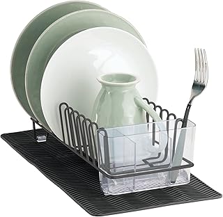 mDesign スチールシンクディッシュ乾燥ラック/ディッシュ水切りストレージオーガナイザー ワイヤー水切り付き キッチンカウンター用乾燥マット 簡単水切り/乾燥皿 プレート 台所用品 コンチェルトコレクション 2個セット ブラック/ダークグレー