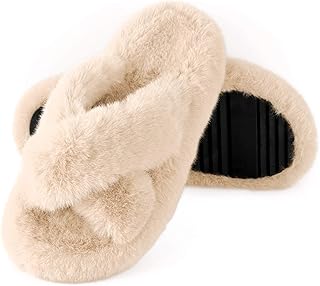 WATMAID ファジースリッパ レディース ソフト ふわふわスリッパ レディース ガールズ ファースリッパ オープントゥ ハウススリッパ インドア アウトドア US サイズ: 8.5-9 カラー: ベージュ