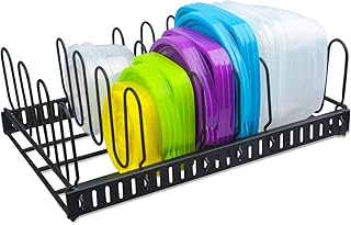 メタルフードコンテナ蓋オーガナイザー&調節可能な仕切り6個収納コンテナ蓋ホルダーラック キャビネット 食器棚 パントリー棚 引き出し用 キッチンを整理 ブラック(特許出願中)
