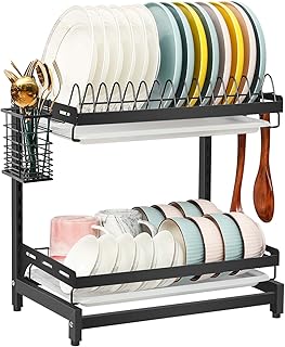 X-cosrack 食器乾燥ラック 2段 304 ステンレススチール 水切りボード用具ホルダーフック付き 高さ調節可能 取り外し可能な水切り器 キッチンカウンタートップ用 ブラック