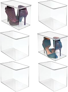 mDesign 積み重ね可能 クローゼットプラスチック収納箱 蓋付き - 男性用と女性用靴、ブーティー、パンプス、サンダル、ウェッジ、フラット、ヒール、アクセサリー - 高さ9インチ、6個パック - クリア