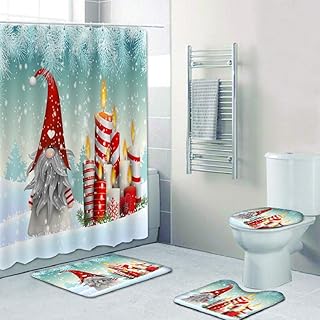 Novobey クリスマスシャワーカーテン4点セット 滑り止めラグ トイレ蓋カバー バスマット かわいいノーム 雪だるまキャンドル 冬 雪の結晶 シャワーカーテン フック12個付き クリスマスバスルーム装飾用