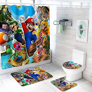 NIAMH PAGE 4ピース Su-per Ma-Rio シャワーカーテンセット 滑り止めラグ トイレ蓋カバー バスマット 丈夫な防水シャワーカーテン フック12個付き 71x71インチ