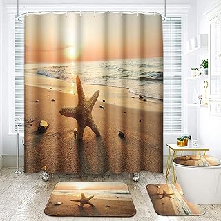 ArtSocket シャワーカーテン4点セット ヒトデ ビーチ サンセット 旅行 砂 ブルー オーシャン 滑り止めラグ トイレ蓋カバー バスマット バスルーム装飾セット 72インチ x 72インチ