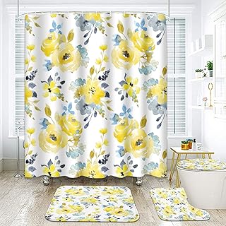 ArtSocket シャワーカーテン4点セット イエロー ブルー 抽象の花 花柄 水彩画 ヴィンテージ 夏 ロマンチック 滑り止めラグ トイレ蓋カバー バスマット バスルーム装飾セット 72インチ x 72インチ